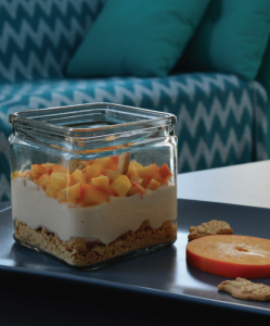 - Se ornează cu kaki tăiat cubulețe și cu 2-3 biscuiți.